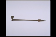 | Description | WOODEN SHAFT WITH CONICAL WOODEN BUTT AT ONE END AND METAL AXE-HEAD AT THE OTHER DECORATED WITH SHELLS AND VEG. FIBRE |