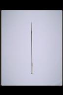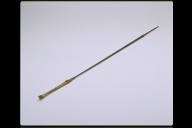 説明 骨製の穂(槍先)が付いた木製の槍。穂の元に貝殻と植物繊維の装飾がある。
