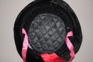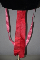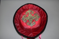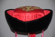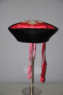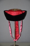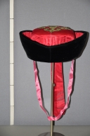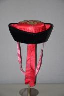 | キャプション | 赤の繻子織地 頭頂部に金糸を用いた絵緯布をアプリケ 鍔に黒ベロア地をアプリケ 裏地は黒の繻子織でミシンを使用 赤の繻子織布の飾り付 顎紐はピンクのリボン |