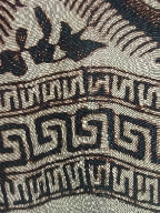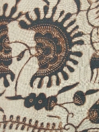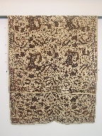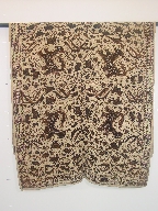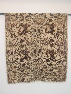 | キャプション | 布地標本 226.0cm×107.0cm 長方形 茶の型染 布2枚を横に接ぎ合せ 4辺のうち2辺耳で2辺裁ち目 裁ち目の始末済み(ミシンで三つ折り縫い) 補修痕 |