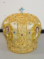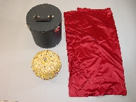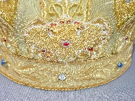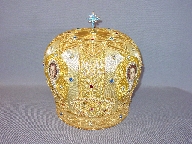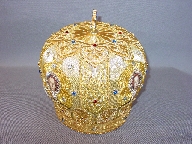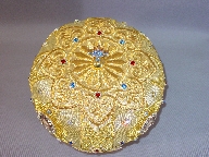 | キャプション | 金糸刺繍 多色のガラスビーズ(?)をはめ込み 内側は金色の繻子織地 すべり(サイズリボン)は合成皮革製? 付属品(丸鞄型ケース・赤の繻子織布)あり H230387~H230400で1セット |
