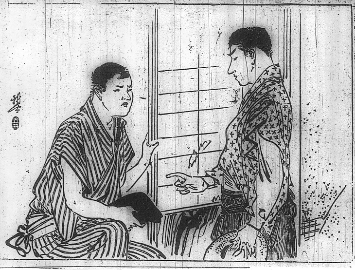 | 説明 | 法科大学、現在の東大法学部の卒業を前にしたふたりの学生。迎えているのは、この家を何人か共同で借りて住んでいる学生のひとり、「性の脱けたような洗い晒しの白縮の浴衣を裾短かに」着ている。縮は肌ざわりからやや上等な浴衣地として好まれた。この青年は家のせいか兵児帯をゆるく結んで、きものの下には肌着のシャツも着ていないらしい。右側の訪れた青年は学友を見舞いに行く友に、お菓子を託している。白絣のきものの下には、カフスのある長袖の白シャツを着込んでいる。おそらくこのホワイトシャツは肌着でもあったから、ずいぶん汗ばんで袖や襟なども汚れていたことだろう。袴を穿いて手には麦藁帽子を持っている。暑い盛りに袴を穿いている、という点に学生らしさが見えている。(大丸 弘) |