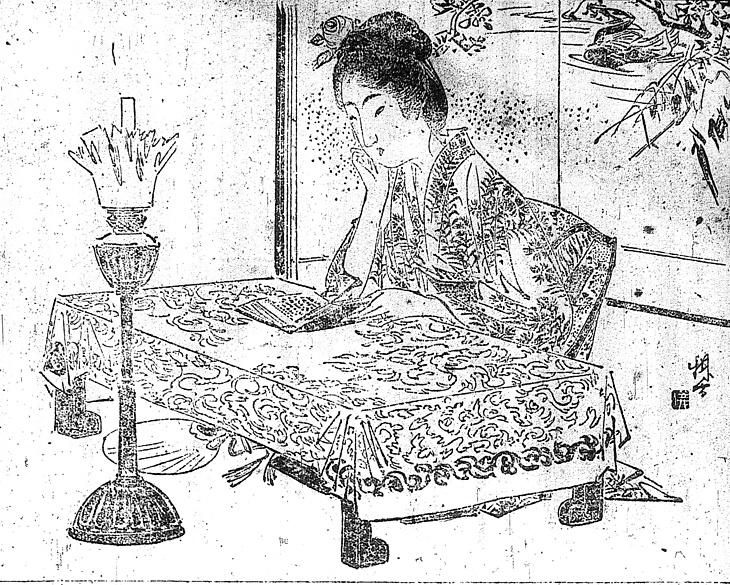 キーワード 金持ち;中形の浴衣;読書;花飾り;お太鼓結び;頬杖を突く;うちわ;座敷ランプ;テーブルクロス;屏風
