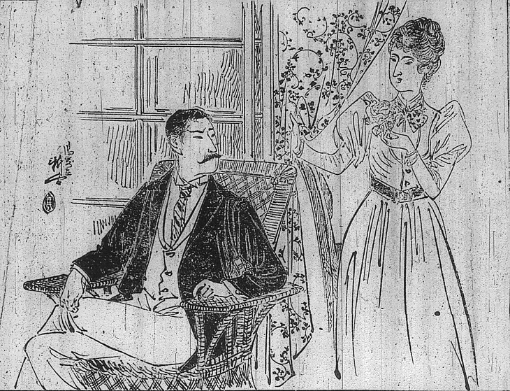 説明 米国留学から帰朝した牧師と、そのアメリカ人妻。明治期の小説にもときおり欧米人が登場する。日本画家が線描で西洋美人を描こうとすると、鼻筋の通っているのは描きやすいが、眼窩の窪んでいる特色は表現しにくい。そのため、目の周辺にしつっこい線を加え、二重瞼とするのがふつうだ。(大丸 弘)