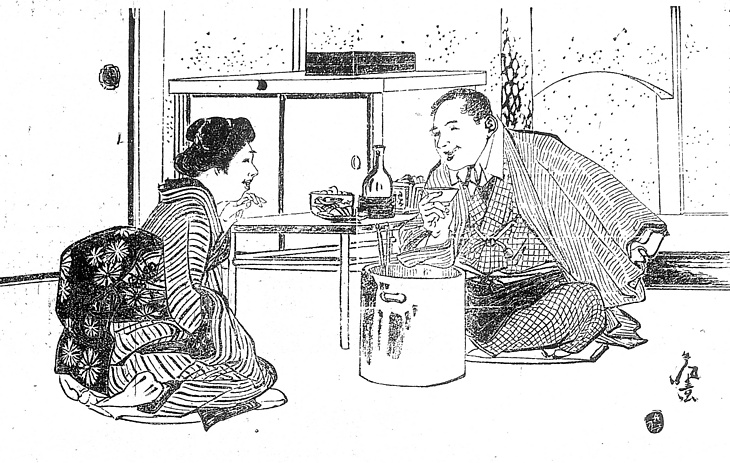 | 説明 | 大阪の商家の手代と同じ家の女中とが近所の小料理屋で会っている。時代は変わっても商家の使用人といえば縞物尽くめが決まりだが、若い手代の身分だとおおっぴらに羽織を着ることはできないのがふつうだ。女中、といえば不器量で、「大道臼の尻」とあるように、恰好悪く太っていることになっている。彼女の髪は銀杏返しらしいが、この髪ばかりは、女中も結えば女将さんも結う髪だった。(大丸 弘) |