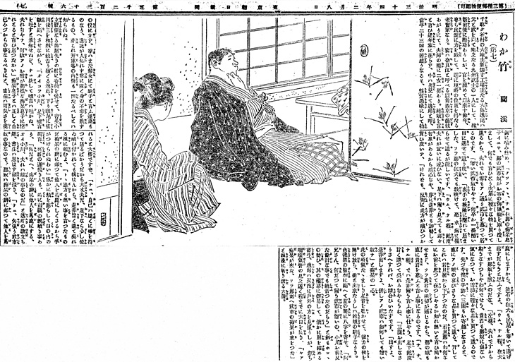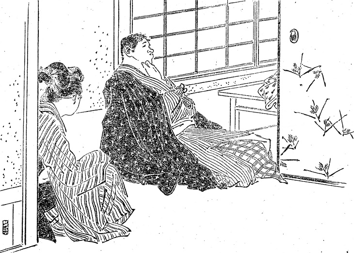 説明 この時代はまだ東京府下の田園地域だった千駄ヶ谷辺の、大地主の馬鹿息子。狭い額と下がり目、窪んだ鼻筋で「性質愚昧にして物の役に立たず」という人間を表している。かたわらに座っているのは妹娘で「蓮っ葉者」とあるがここでは大きめの島田髷と引っかけに結んだ帯しかわからない。本文は大部分息子と書生の会話で、頭の働くらしい書生が、坊ちゃんを馬鹿にしながらも、せいぜい機嫌を取っている様が述べられている。この時代は親の仕送りを期待できない学生の中には、男手を必要とする家の書生として住みこむ者がけっこういた。馬鹿息子は座敷の境の敷居の上に座って柱に背をもたせかけ、懐から出した手で顎の髭を抜いている。その指でさらに鼻毛でも抜けば誂えたような図になるはず。(大丸 弘)