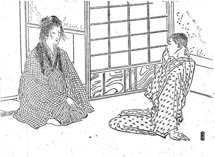 説明 東京府下の物持ちの家の内玄関を訪れた得体の知れない女。押され気味に応対しているのはこの家の若い書生。女の風態は「結び髪に黄楊(ツゲ(柘植と書くことが多い))の横櫛一枚、袢纏前だれがけという裏屋向きの女房扮装(イデタチ)なり」だが、いきなり片膝を立てて大きな口をきいているのは、なにかしらいわくのある証拠。じつはこの家の芸者上がりの後添えとなにか関係があるらしい。結び髪といえばどんな髪型も結び髪にちがいないのだが、結び髪とかつくね髪というとキチンとした髪ではなく、いい加減にまとめた馬の尾とか、じれった結びとかを指す。この女の髪は達磨返しのように見えるが、もとより自分で手軽にまとめるものだから名前の詮索はしないでおく。(大丸 弘)