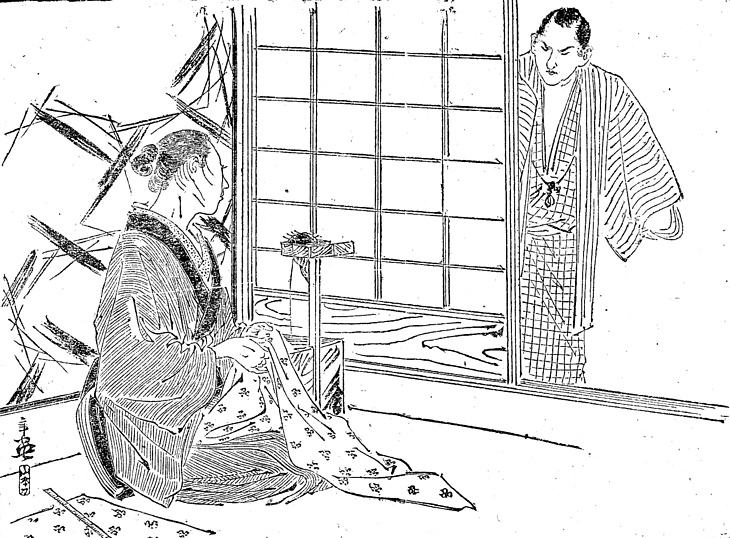 | 説明 | 裏店は障子一枚が外と内との境ということもある。その障子を開けて中を覗いているのは町内の鳶の若者。大体が半纏で過ごしている稼業の人間が羽織を着ているのは、なにかあらたまったことでもあったついでに寄ったのか。鳶の暴れ者というより商人風。内にいるのは五十五になる絵師の後家。名利に無頓着だった画人の亡きあと、父のあとを追って絵の道に精進する二十五になる一子とともに、九尺二間の家で「貧民窟」住まいをすることになった。「見る影もなく窶(ヤツ)れ果てたれど、どことなく品位備わりて、根からの卑しき人とは見えず」とあるように、継ぎも見えない縞のきものをきちんと着こなし、勝手口の明かり障子のそばで針仕事をしている。貧民窟というとおきまりの障子や壁の破れも描かれていない。この時代は五十五というとすでに老婆で、髪は無造作な手づくねで馬の尾風。いぼじり巻(疣毟巻)とか、いろいろにいわれた。髪の量がいちじるしく減り、髷のひどく小さいのが老人の特色。背筋がピンとしているのは品位のしるしだろう。(大丸 弘) |