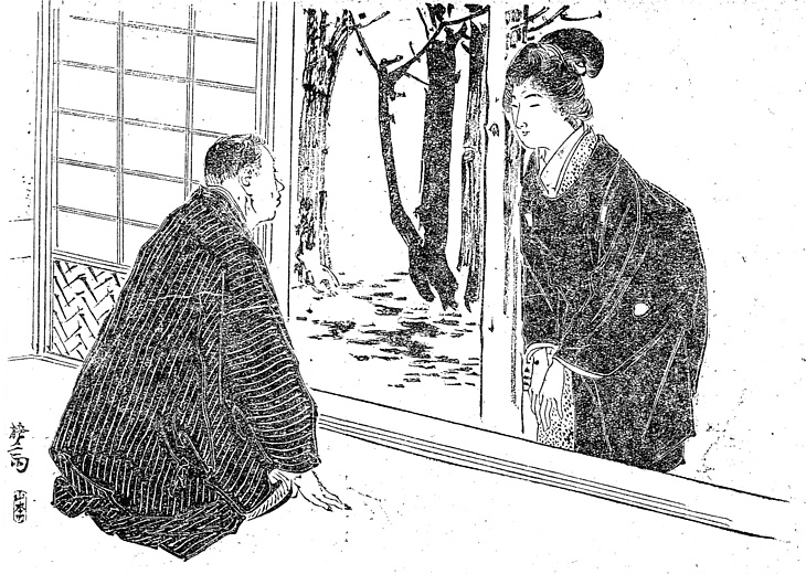 | 説明 | 家作持ちの家を訪れたのは三十前後の色白の年増、夫と死に別れたあと生花を教えるために、二階のある六間の家を借りようと。寺裏の寂しい場所で女中とのふたり暮らしだが、「私は変人で淋しいところが好き」と自分から言う。「小紋縮緬の小袖の上に、五つ紋の黒七子の被布を着ている」。羽織と比べると被布はいくぶんもったいぶった感じもあるので、御隠居さんや、師匠とか宗匠とかいわれる身分の人に向いている。髪は既婚のしるしの丸髷。薄痘痕(ウスアバタ)のあることを繰りかえしているが、幕末明治初期を通じて種痘は奨励はしたが強制ではなかったこともあり、1920年代頃まで疱瘡の跡の、女性だったら化粧で隠せる程度の薄痘痕を持つ人は、そうめずらしいことではなかったらしい。(大丸 弘) |
