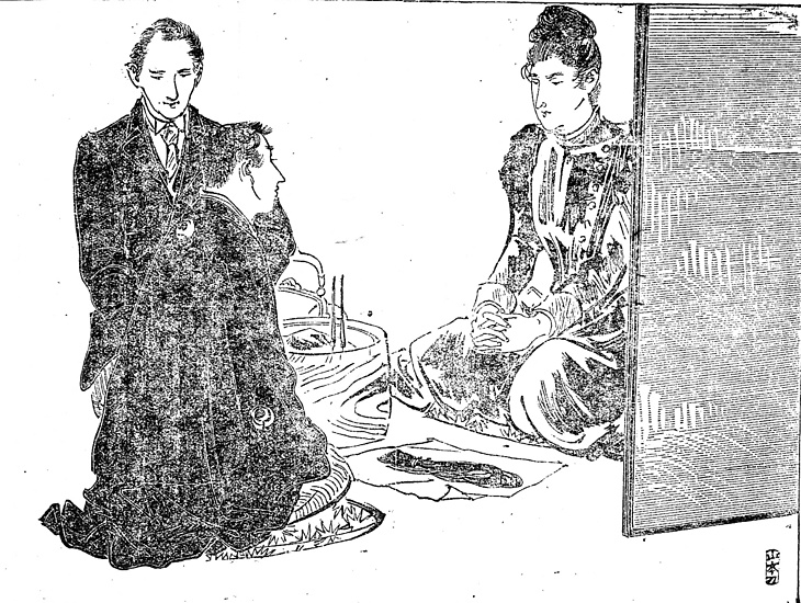 | 説明 | アメリカから帰朝したばかりの英語教師が、畳の上に「洋服で不様(ブザマ)に坐って」いる。一緒に彼の地に行ったこの家の令嬢の臨終の様子を報告するという、つらい役割を負っている。この時代の挿絵画家たちは、欧米のファッションをほぼリアルタイムで目にする手段を持っていたらしく、洋服を描いてそれほど時代錯誤ということはない。1901(明治34)年当時は肩口の盛り上がり――gigot sleeve(ジゴ袖)はトップファッションではなかったが、街ではごくふつうに用いられていた。しかし如何せん、日本座敷でのこの時代の女性の洋装は、よほど小柄の女性ででもないかぎり、御神輿が座敷に入ってきたようになる。(大丸 弘) |