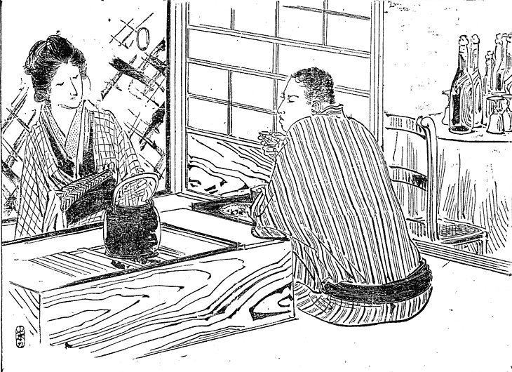 | 説明 | 物語は浅草の銘酒屋ではじまる。銘酒屋はその名の通り各地の銘酒を飲ませる簡易酒場だが、文化史の上では私娼窟ということになっている。本編でも冒頭に、「夜目遠目傘の内を命とする稀代の美人、声を限りに客の名を呼び居れる」とあって、こういうところに美しい女などは滅多にいることはないにしても、ともかく若い女の色気で客を呼んでいたらしい。椅子と丸テーブルというハイカラな店内だが、その奥には、長火鉢をかたわらの女将が控える畳の部屋があるという、新旧混交の店構え。女将の頭は第2回でわかるように古風な達磨返しか、毛だるま風。前髪、鬢(ビン=横髪)、髱(タボ=後ろ髪)はふつうに取って、髷はつくらず残りの毛は捻っている。黒襟付ききものの前を帯の辺りまで開いているとか、帯を折り返して締めているとか、下町風といってもごく野卑な恰好だが、眉を剃って目鼻が小さく書いてある挿絵の顔であると、やさしげに見える。(大丸 弘) |