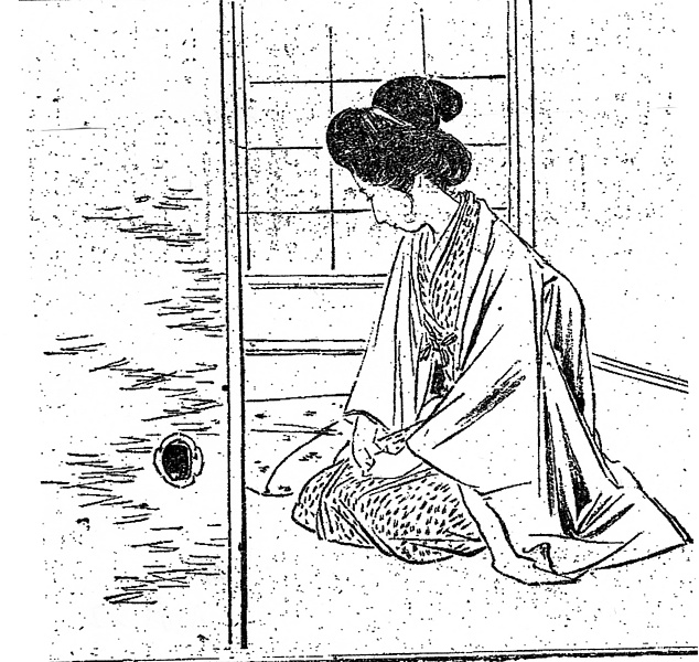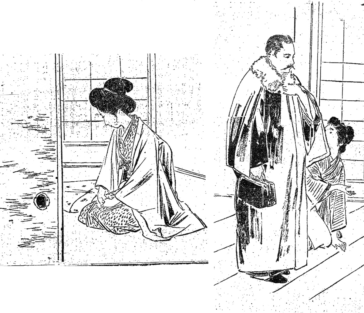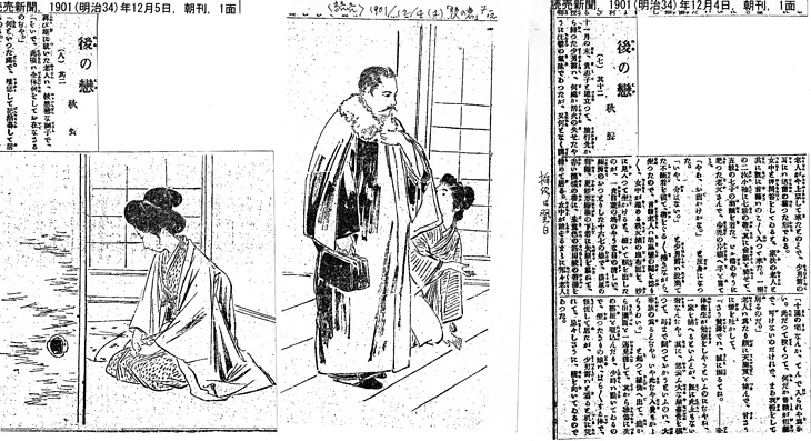 説明 前日12月4日号の新聞に、12月5日号の服装についての描写あり。「一楽の二枚小袖に七珍の帯、其に金鎖を絡せて五紋の七子の羽織を着た、ビル樽のやうに肥つた老父さんで(……)」。「一皮目蓋の鳩のやうな目の清しい、細面のおつとりした十六七の娘で、淡鼠の羽織、更紗形縮緬の下着に矢絣を襲ねて、赤い模様の帯に、朱鷺色の匹田絞の帯揚を締めて居る」。(大丸 弘)