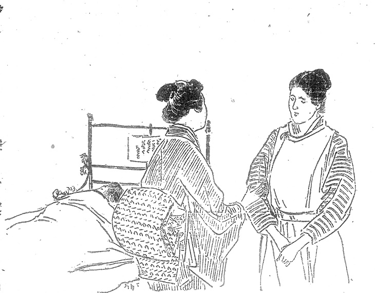 | 身装画像コード | H853:[病院;病室;医療施設] D4is:[医師;看護婦;病人の世話をする人] Wmae:[前掛;エプロン;割烹着] D3ob:[帯の締め方;帯の位置] |