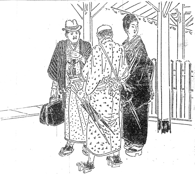 | キーワード | 中折帽子;中折れ帽子;メリヤスシャツ;シャツの袖口;ぞうり;指をさす;高下駄;革かばん;かばんを肩から掛ける;木履;ぽっくり下駄 |