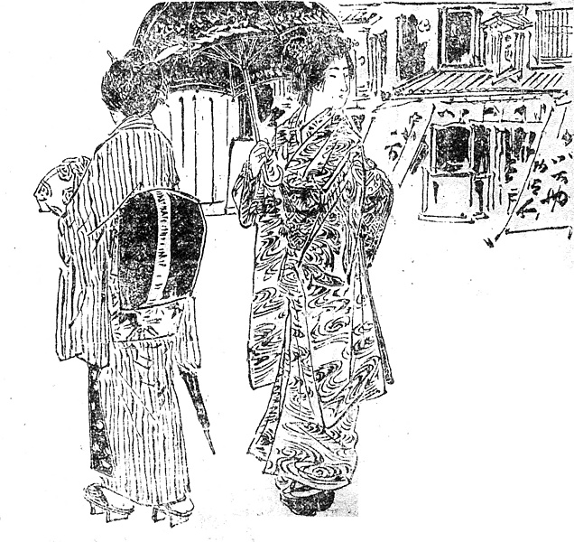 | キーワード | お嬢様;総柄のきもの;女中;竪縞のきもの;お太鼓結び;前垂れ;洋傘;蝙蝠傘;こうもり傘;日傘;小間物屋 |