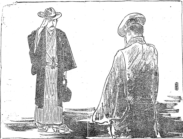 | 説明 | 病家を見舞った医師が、たまたまその家の主人の藤岡と挨拶を交わしている。ふたりともこの時代らしくかなり縁の広い中折帽。帽子を被る習慣ができて以来、その帽子が挨拶の小道具として役に立つようになる。ときにはその帽子の縁に手をかけるだけで軽い会釈の意味にも。帽子が廃れた現代では夏にソフトハットや野球帽を被っているような場合でも、その扱いが下手になってしまった。医師は黒紋附の羽織に縞のきもの、ノメリの下駄を履いて往診鞄を片手に提げている。相手はこの村の物持ちで、「外套の袖を風に吹かせて」と前回の本文にあるように、トンビを和服の上に羽織っている。このトンビにはベルトが付いているが、ベルト付きだから独逸鳶(ドイツトンビ)という、とはかならずしも決まっていないようだ。(大丸 弘) |