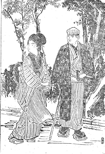 説明 連載ものは第1回に主人公のくわしい紹介があるのがふつうで、この時代はその紹介の半ばは着ているもの、つまり衣裳付けといわれる内容になる。「場違い銘仙の綿入れに、唐縮緬と小柳繻子の昼夜帯、前垂だけは八丈の牛蒡縞。扮装(イデタチ)だけで判断すると、先ず職人の娘であろうか。貌容(カオカタチ)の美しさ、飾れば何処までも上品になり、粧(ツク)れば何処までも意気になる、好悪(スキキライ)はさて置き、十人が十人、美形という点に付いては許すほどの女振。年は十八,九の間、二十にはまだ届くまい」。そんな美人を画家の右田年英はむかしながらの浮世絵式、つり目、おちょぼ口に描いている。「緑したたる島田の髷」ともある大きな島田は、かなり根が下がっていて、もちろん芸者島田とは違うが下町風の娘島田、髷の先の方、耳といわれる部分が横に挿した珊瑚の玉簪(タマカンザシ)に被りそうに開き、毛の豊かなことがわかる。襟つきの縞のきものに前垂れ掛け、着ているもの履いている下駄は安物、というところで、職人の娘、というお見立てになる。(大丸 弘)