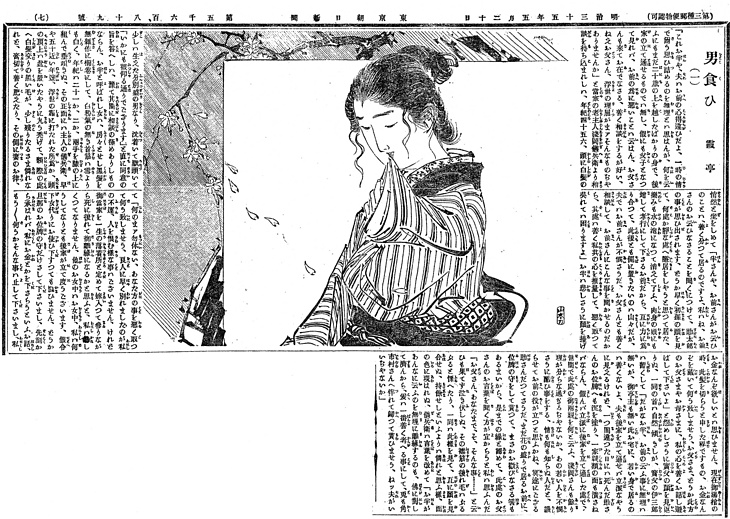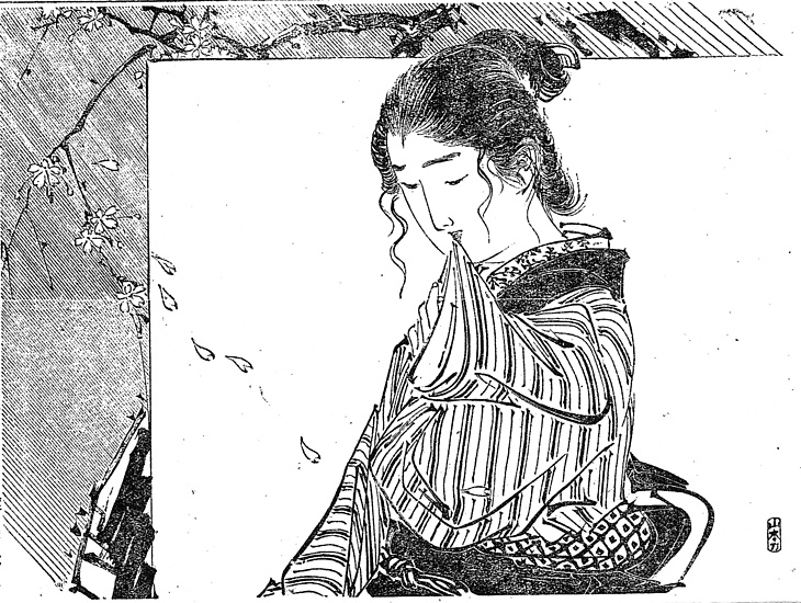 説明 二十歳を超したばかりの人妻が夫に先立たれ、婚家から出るか留まるかの岐路に立っている。「房々とせし黒髪を無造作に櫛巻にして、白粉気の無き首筋は雪よりも白く」とある。髪の毛が非常に多い場合には、櫛巻といっても(ビン=横髪)や髱(タボ=後ろ髪)をかなり膨らますので、前髪の目立たない一種の髷のように見える。縞のきものに黒襟をかけ、半襟にはわりあい目立つ模様があり、黒繻子の帯の下締めの大きな絞り柄も目立つ。民間では服喪の習慣がはっきりしないため、切り髪にでもしないかぎり夫を亡くして間のない婦人かどうかは、見た目にはわかりにくい。きものの縞柄は中子持縞というものに近いが、すべての縞柄に名前があるわけではない。(大丸 弘)