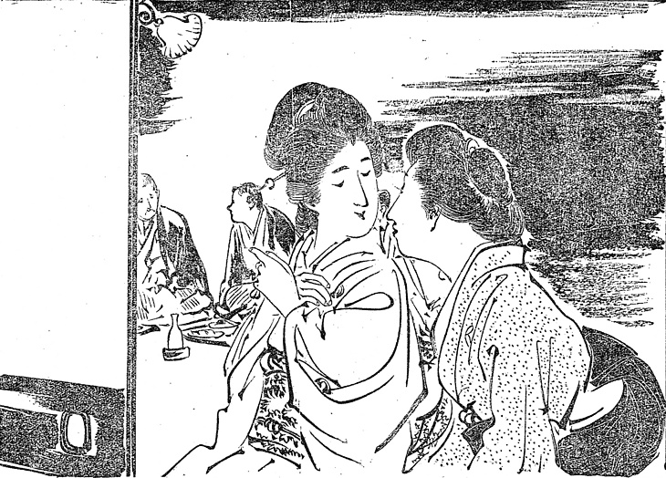 | 説明 | 大阪中之島の料亭の宴会で、二人の芸妓が客の品定め。本文ではそうなっているがいくぶん不審な点もある。振り返っている売れっ子芸者は芸者島田に出の衣裳。後から話しかけている妹芸者が、紋付は紋付だが小紋のきものを着ている。小紋に裾模様をつけ礼装とするのが流行したのは、もう少しあとの時代のはずだが。また髪を島田ではないものに結っている。大阪は東京とちがって明治になっても古い髪型が残っているので、あるいはその中のひとつ――姥子の――種などかもしれない。毛筆の打ち込みが目立ちすぎるいくぶん粗い絵。(大丸 弘) |