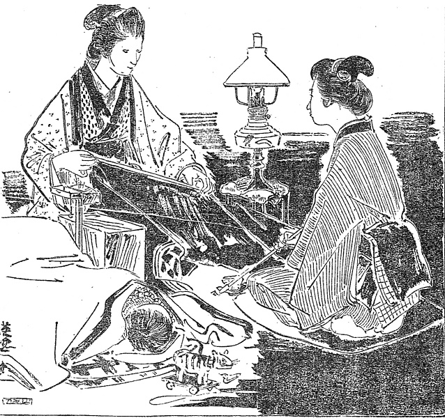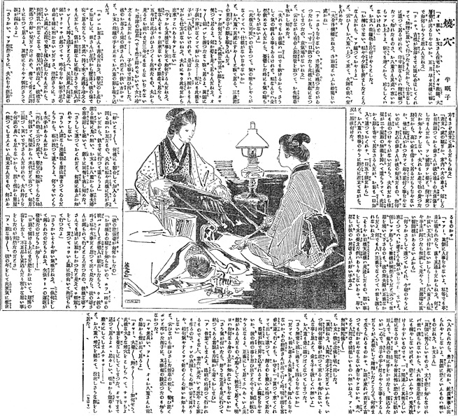 | 説明 | 読切りのショートショートだが、本文挿絵とも情報量は多い。長屋暮らしのふたりの女房が、台つきの座敷ランプを挟んで話している。この家の女のしているのは人仕事。頼まれ仕事ともいう。江戸時代には、女のする「勤め」といえば廓(クルワ)、「しごと」といえば針仕事を意味した。裁縫と書いてしごととルビの振ってあることも多い。女のいま縫っているのは町内の若い者の印半纏。既製品のない時代には、仕立て下ろしに手を通したければ、独り者の男は隣近所のだれかに頼むよりない。文中にあるように洗濯も同様で、そういう人仕事で暮らしを立てている子どもを抱えた後家さんや、身寄りのない婆さんがけっこういたようだ。ふたりの女は既婚者だから、いま亭主がいてもいなくても丸髷。着ているものは羽織ともすべて下町風に黒襟付きで、帯はかんたんな下げ結びにしている。タイトルの焼け穴とは、話に気をとられ、着ているちょくちょく着に、煙草の火を落として台無しにしてしまった、という顛末。ちょくちょく着はチョイチョイ着とも言って、ちょいとその辺に出歩くときの、ほんの少しマシなきもの。長屋暮らしの女房の多くにとってはこれが一張羅だった。(大丸 弘) |