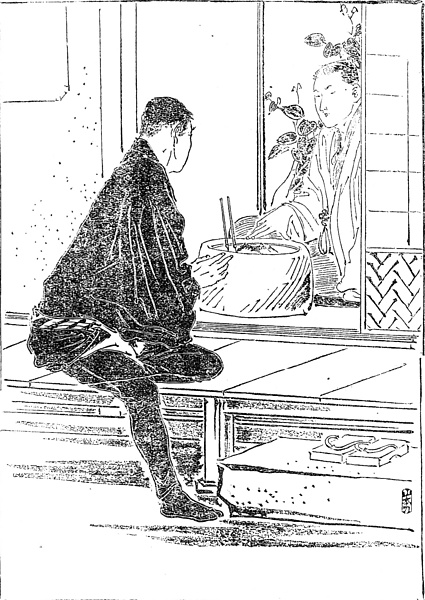 説明 抱えの車夫が中庭の縁先で主人とひそひそ話をしている場面。この時代、営業の人力車夫は着るものにもいろいろと規制ができていたが、個人に抱えられている車夫もだいたいそれに準じた恰好だったようだ。紺の半纏に股引で、足には同色の足袋を履いている。ゴム底の地下足袋が普及するのはもう少し後になる。(大丸 弘)
