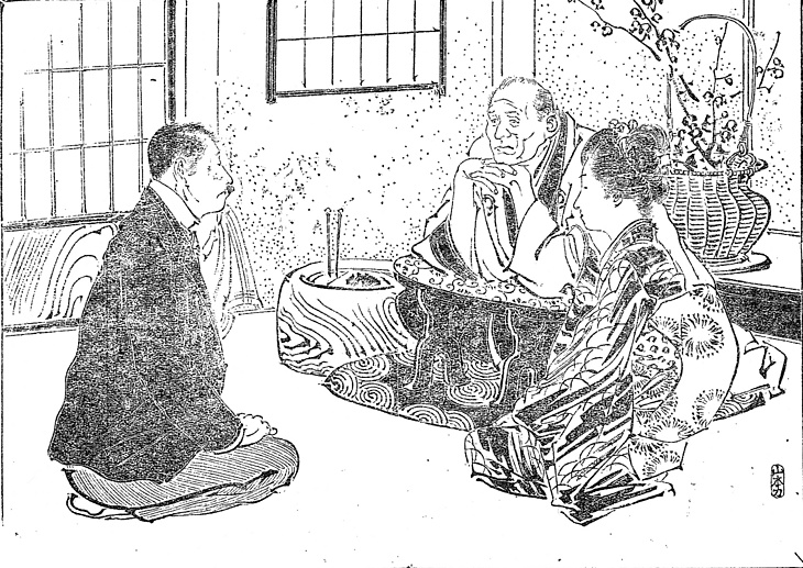説明 資産家が配下の法律顧問と離れで密談する場面だが、酔いが回って足元が危ないため、若い芸妓が介添えしている。脇息を前に置いて凭(モタ)れるのはよほど身体が不自由か、相手との地位の差が大きいときだが、この場合は両方だろう。(大丸 弘)