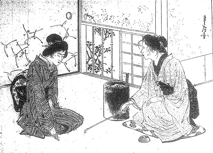 | キーワード | 小紋のきもの;立て膝;長煙管(きせる);火鉢;竪縞のきもの;畳に手を突く |