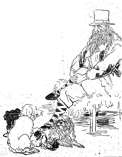 キーワード シルクハット;口髭;顎鬚;毛皮の肩衣;青ビロードの上衣;足を組む;犬