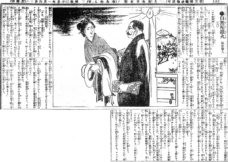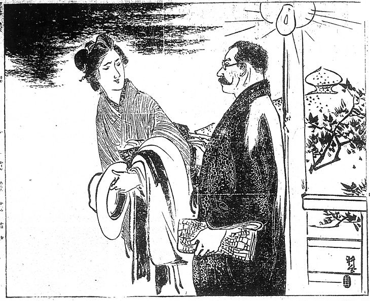 キーワード 女中;竪縞のきもの;帽子等を預かる;銀行の頭取;八字髭;灯籠;離れに向かう