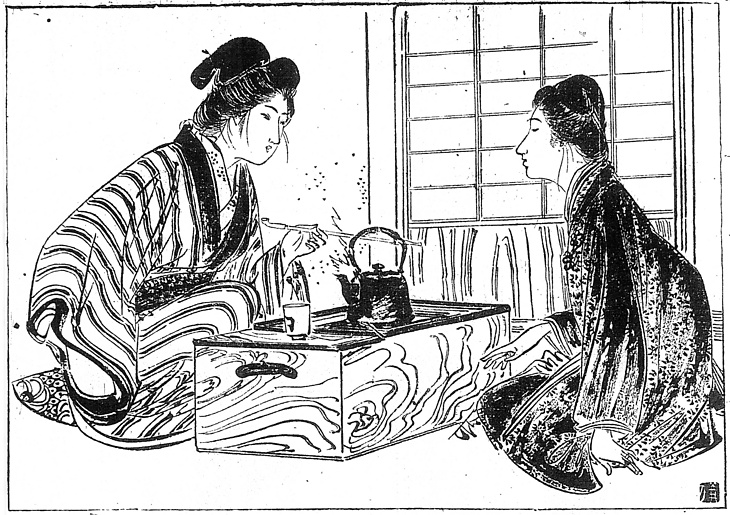 キーワード 黒襟;立て膝;長煙管(きせる);火鉢;銅壺(どうこ);薬缶(やかん);湯呑み茶碗