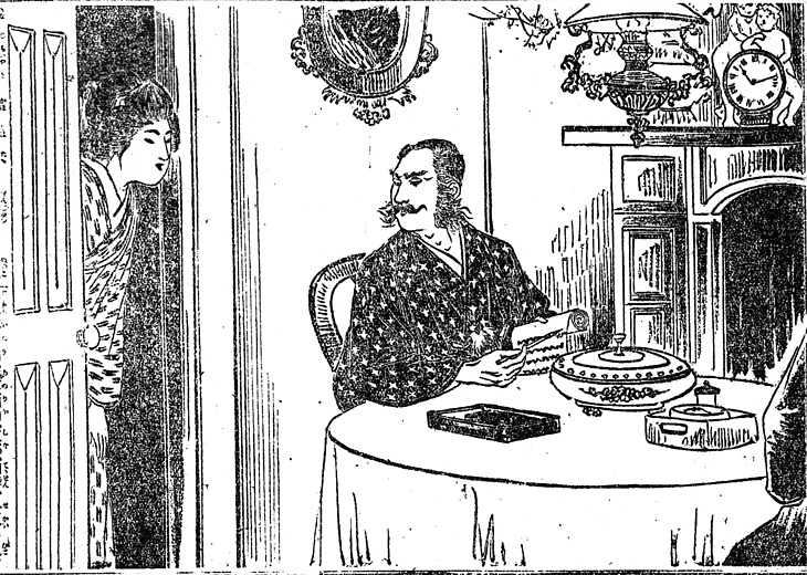 | キーワード | 口髭;洋室;ドア;ドアノブ;暖炉;置き時計;鏡;テーブル;手紙;菓子器;煙草盆 |