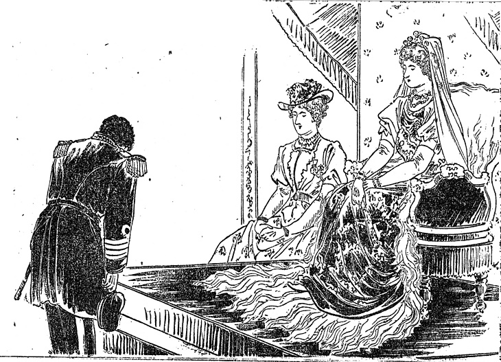 キーワード フランス女王;ヴェール;長手袋;椅子;軍服;肩章;お辞儀(おじぎ);後ろ姿;背面