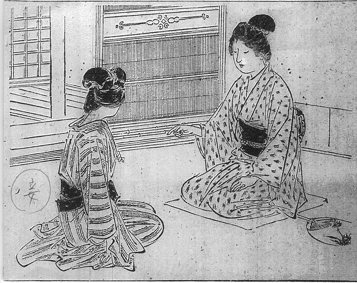 | 説明 | この本宅に一緒に住むことになったお妾を前に座らせて、奥様が細かい注意を与えている。奥様は襟元を詰めてキチンとした着方をしているが、お妾の方は襟を抜き、半幅帯を緩く締めて、だらしのない着方。奥様はもちろん丸髷だが、お妾もこの日丸髷を結っていたのを、すぐ銀杏返しに結い直させられる。銀杏返しは身分にあまりかかわらない髪型だ。奥様は座布団を敷いているが、奉公人であるお妾は畳に座らせられている。食事もお妾は三人の下女と一緒に台所で、板の間にじかに座って食べなければならない。この日の表題が「板の間」となっているのはそのことを指している。(大丸 弘) |