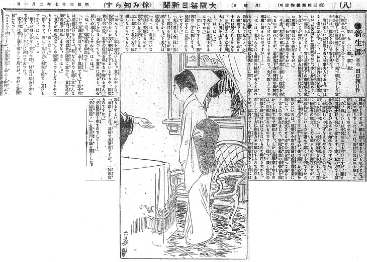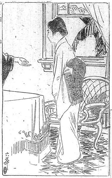 説明 免囚保護という慈善事業にのりだそうという貴婦人同盟会。その同盟会の幹部のひとりが、ある有力者のもとを訪れて、協力を求めている。「客は美しい訪問服を着た判事夫人である」とある。訪問服という言葉は1890年代半ばには現れているが、さかんに使われるようになったのはこの時期。ある流行案内には、「最も売れ行きの可いのは、やはり引きつづき縞御召」(→年表〈現況〉1904年5月 「春の袷」【新小説】1904年5月)とある。訪問着という言い方は少し遅れる。夫人の縦型束髪は、この時代ではいくぶん古風な、前、横を膨らませないタイプで、夜会巻などもその一種。あるいは夜会巻かもしれない。(大丸 弘)