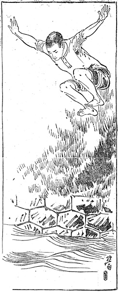 | 説明 | 車から投げ出されて堀に落ちた令嬢を救うために、羽織袴を脱ぎ捨てて飛込む若者。文中には「莫大小(メリヤス)の肌着」とのみある。シャツは丸首でボタン掛けになっているのがふつうだったから、和服の場合はそれが胸元にはっきりと見える。また「猿股」はこのような太縞の柄物が多かったようだ。(大丸 弘) |