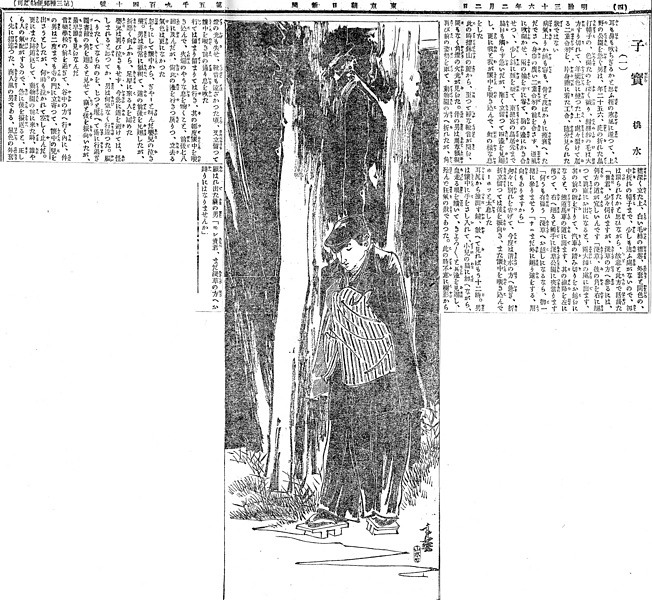説明 季節は真冬、深夜の上野公園内をさまよう若い男。「庇(ヒサシ)の折れた鳥打帽子の色褪せたのを深く被り、紺羅紗の毛は大方擦り切れて羊羹色に変わった上、所々裂けている二重合羽を片身垂に着た具合、随分見られたざまではない」とある。世間を憚って暮らしている女とのあいだに生まれた子を、山内のどこかへ捨てようとしている。懐の赤ん坊の泣き声でそれと勘づいた勘づいた男が近寄って、私が貰おうと申し出た。これは「鼠色の外套襟深く立てた上、白い毛糸の襟巻、外套と同色の中折の帽子」という姿のこの、近くに店をもつ洋服屋の主人。色は若者の紺にたいし薄鼠か、構造はいくぶんちがっても同じく羽根つきの二重外套。ここでは二重合羽と言っている。若い男の履いている下駄は無骨な両刳、足袋は書生っぽい紺足袋。洋服屋はノメリの下駄で白足袋。(大丸 弘)