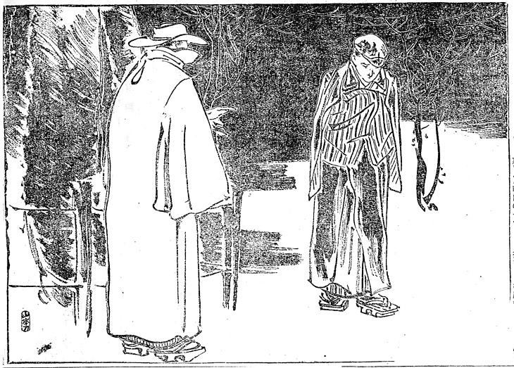 | 説明 | 季節は真冬、深夜の上野公園内をさまよう若い男。「庇(ヒサシ)の折れた鳥打帽子の色褪せたのを深く被り、紺羅紗の毛は大方擦り切れて羊羹色に変わった上、所々裂けている二重合羽を片身垂に着た具合、随分見られたざまではない」とある。世間を憚って暮らしている女とのあいだに生まれた子を、山内のどこかへ捨てようとしている。懐の赤ん坊の泣き声でそれと勘づいた勘づいた男が近寄って、私が貰おうと申し出た。これは「鼠色の外套襟深く立てた上、白い毛糸の襟巻、外套と同色の中折の帽子」という姿のこの、近くに店をもつ洋服屋の主人。色は若者の紺にたいし薄鼠か、構造はいくぶんちがっても同じく羽根つきの二重外套。ここでは二重合羽と言っている。若い男の履いている下駄は無骨な両刳、足袋は書生っぽい紺足袋。洋服屋はノメリの下駄で白足袋。(大丸 弘) |