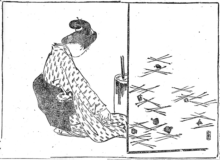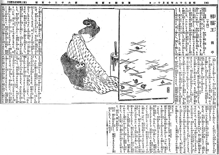 説明 富豪の相続人のすり替わりをテーマとした物語で、ここは妻が夫に、本当の夫かどうかと問い詰める場面。その妻は下を向いているし、夫の方は襖の陰なので、読者は挿絵画家の右田年英にうまくすかされたような具合とも言えるが、近代文学が人間の内面を追うようになってくると、人物の表情やポーズではなく、情景の扱いによって、人物の心の深奥を感得させようとするような絵柄が多くなる傾向がある。(大丸 弘)