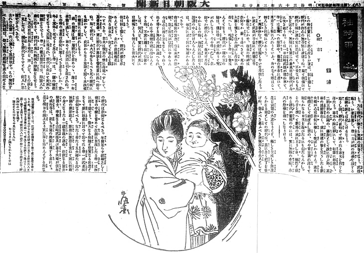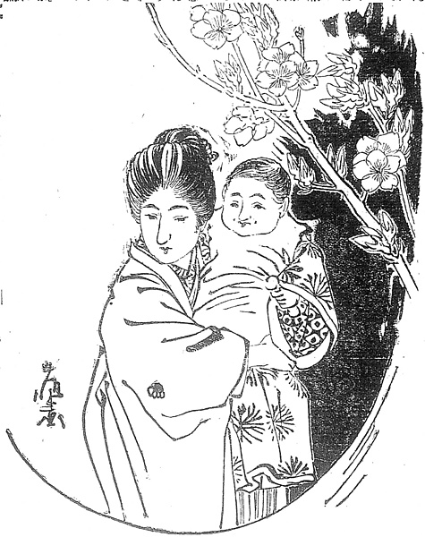 説明 乳飲子を抱き上げる若い母親。生まれてまのない赤ん坊にしては、愛嬌のある顔をしている。乳児の頭髪を剃って、それからお芥子(ケシ)とかお煙草盆とかいう奇妙な髪型にする風習はもう廃れていたが、ぬいぐるみのような厚着をさせる習慣はなかなかなくならず、小児科医などが繰り返し警告していた。母親の結っている髪は、1890年代の縦型束髪から、やがて全体が膨らみだし、さらに前髪が突き出して、廂髪(庇髪)(ヒサシガミ)に移る、それまでの中間の時期を示す。名前だけはよく知られている花月巻が、ちょうどその時期のもの。ただし花月巻は、前方からはわからない頭頂部のスタイルだから、この女性の髪型は、強いていえば花月巻風、ということになろうか。(大丸 弘)