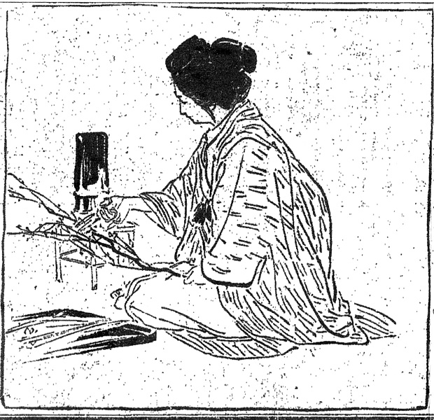 | 説明 | 独り者のこの家の主人の、身の廻りの世話をする三十代の女中。「四十には未だ届かぬほどの中年増で、頭髪(アタマ)を丸髷に結って、双子の上に擬(マガイ)琉球の羽織、ちょっと垢抜けのした、品のある婦人」とある。最初の妻と離別した森鴎外は、三十七歳の独り身で小倉に赴任したとき、要りもしない二人の女中を家に置いている。たまたまこの作品と同じ年のことだ。しかし世の中には、そんなことに頓着しない男の方が多かったにちがいない。この挿絵は略筆の早描きなので、細かいところを云々しても仕方がないが、丸髷にしては前髪も髷もすこしおかしい。むしろこの頃はやりの束髪のように見える。また、女中が家の中で羽織を着て花を生けることも、ないとはいえないだろうが。(大丸 弘) |