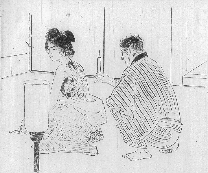 キーワード 背中;刺青;入れ墨;黒襟;竪縞のきもの;兵児帯;ランプ;蝋燭