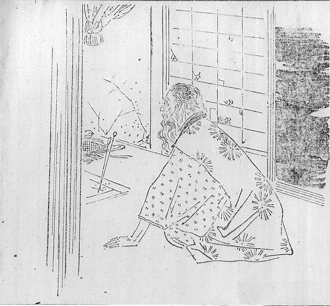 | 説明 | 旧主人筋の若君が銃猟の途中で道に迷い、たまたま山中のこの陋屋を訪れた。老人は破れ畳みの上で寒い思いをさせまいとして、持てるものすべて、娘のだいじな晴着までを若君のために提供している。「赤毛布(アカゲット)の真ん中へ、色の褪せた貉菊(ムジナギク)模様の更紗の茵(シトネ)、三枚重ねた其の上に娘の肩掛(ショール)を畳んで敷いて」、そこに座らせられた若君は、「猟服の上に此の家の娘お雪の晴着を羽織っている。大きな亀甲絣の米琉に、小菊模様の絹更紗の下着を重ねて、紫メリンスの扱帯(シゴキ)を巻きつけたが、長い振りからこぼれる紅絹裏、袖も通さず後へ投げて(……)鷹揚に坐るのであった」。これではまるで女装をしているようで、そのきものの持ち主は現にそばにいるというのに、若君は平然としている様子だ。画家はさすがに、その姿をあえて描こうとはしていない。両手をついている老人は小紋柄のきものに、袖無し羽織――関東でいうちゃんちゃんこを着ている。ちゃんちゃんこを着ると、急に年寄りくさくなるようだ。(大丸 弘) |