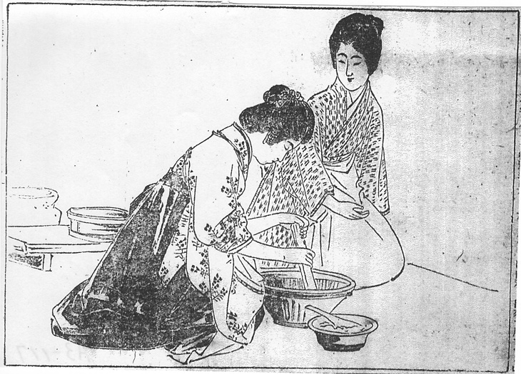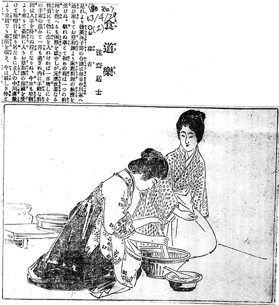| 説明 | 子爵家のお姫様が父親の考えにより、知りあいの家庭婦人から和漢洋折衷の実用的な家庭料理法を学んでいる。お姫様は十九歳で女学校出、そのためか料理を習いに来るのに通学服のような恰好で乳の下までの袴を穿いている。じつは女学生の袴がいちばん有効だったのは体操着としてや、割烹の時間の前掛け代わりだったともいう。そのため、たいていは一枚しか持っていない女学生の袴は、海老茶など濃い色のためよくはわからないが、ひどく汚れているのがふつう、といわれた。このお姫様はそれが料理の実習に来るためであっても、長い袂のきものでなければ、外出できないものと思い込んでいるのだろう。かたわらの家庭婦人もお姫様も束髪で、この時代には髱(タボ=後ろ髪)がかなり出ているため、横から一見すると日本髪とまちがえそうだ。(大丸 弘) |