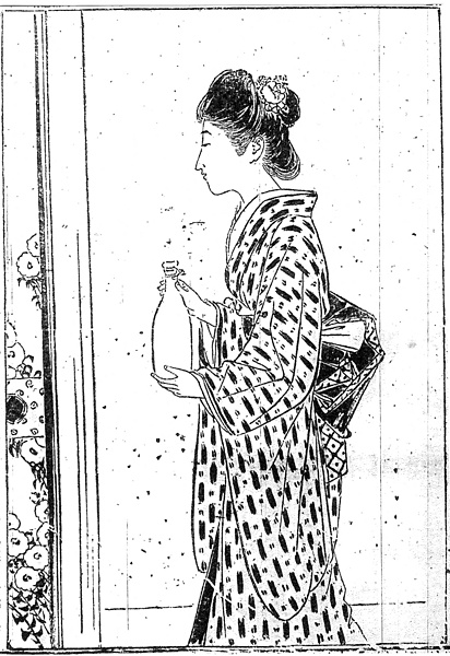説明 牛乳瓶を持って廊下を歩く娘。高等女学校へ通っている娘としては襟を抜いている。校門に入るときは気を遣わなければならないが、家に帰ればただの町娘なのだから、なにをどう着ようがかまわない。しかし振袖を着ても女学生風を守る人もあるし、またイメージチェンジを愉しんだ人もあるだろう。ただし、かつてだれもが抜襟をしたときには、朝の起きぬけにかならず襟白粉はつけるものだった。襟首に白粉気がなく地のままの抜襟は、この時代ずいぶん悪く言われている。この娘の束髪は、もちろん英吉利巻、あるいは上巻系だが、後ろ髪が膨らんでいるだけでなく、前髪が高くなって、花月巻の外見とよく似ている。1903(明治36)年頃から三,四年間の、束髪の変容の中のひとつのスタイルと言えるだろう。(大丸 弘)