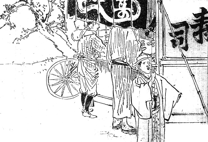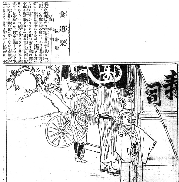 説明 挿絵の屋台はとくに茶碗鮨とは関係なく、ふつうのにぎりの屋台である。屋台の寿司では志賀直哉の『小僧の神様』が私たちの印象に残っている。 三人の客のそれぞれちがう身なりから見ても、この屋台が、けっこう広い客筋を持っている評判の店であることが想像される。(大丸 弘)