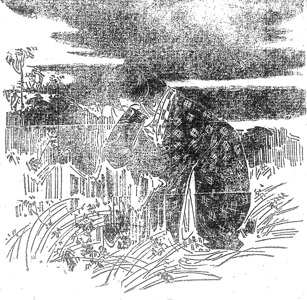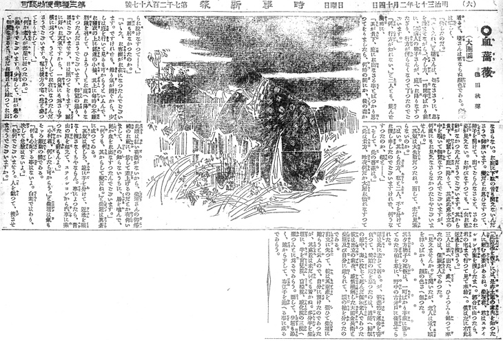 説明 「芳紀(トシ)は正に十九、太い銘仙の袷に亀甲の絣、髪を花月巻とか云うのに為て、白い薔薇の簪(カンザシ)を挿している。一見何となく幽なる趣があって、色の白いのと、眉の優しいのと、眼の清々しいのと、髪の濃いのが眼に立って(……)」と、第16回にはある。このヒロインは東京府下の辺鄙な場所で生まれ、不幸な境遇の中で育った、「野末に咲いた野菊のような女」と彼女を庇護する男性は誉める。引き合わされた友人は、「女学生風であるが、牝鹿のような優し味があって、品格と愛嬌とふたつながら備わっていた」と見た。その第16回,大団円のような花月巻に結うようになったのは、庇護者の男性を知った頃かららしく、それ以前、ふつうに島田を結っている姿が第18回。(大丸 弘)