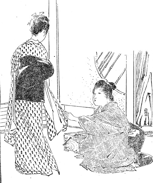 | 説明 | 結婚を急がせる母親と、それに従おうとしない娘。娘には親の決めた許婚があるが、それは意中の男性とはちがう。話を打ち切って立とうとする娘の袂を、母親はつかんではなさない。振袖はこんなとき着ている人には拘束になる。母娘の間でそんなことはないにしろ、つかんでいる手を放そうと無理に引けば、袖付けのほころびることがあるから、こちらも自分の袂をつかんで振りはらう。下着や長襦袢が八ツ口から飛び出している。母親は四十代の女の小ぶりな髷の丸髷、娘は縦型の束髪だが、この時期は前が高くそびえるようになっているのが特色。(大丸 弘) |