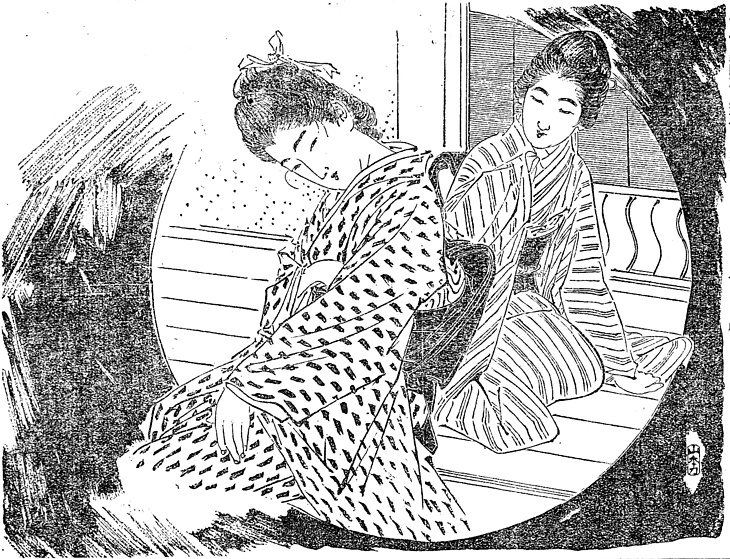 | 説明 | 伊豆半島葉山の町外れに閑静な別荘を抱える一家のお嬢さま。自分の知らないうちに親同士のあいだで結婚話がとりきめられている。しかし自分には密かに想っている人がある。それで気病みして、別荘でひとり過ごしたがる。このお嬢さまの髪型は1890年代(明治20年代)の縦型束髪だが、前を大きく膨らませ、そのため毛の少ない人は前髪かもじを入れる。髱(タボ=後ろ髪)は日本髪の髱と変わりなく下がっている。このスタイルは前年あたりから見られるようになったもので、いわゆる花月巻、といわれるものに共通するようだ。花月巻はある資料では、「円輪のグルリに残りの毛を花の如くからませてある処から名づけた」と言っている。しかしそのかんじんの髷の部分は、あまりよくわからないし、きまりきったものでもなかったろう。(大丸 弘) |