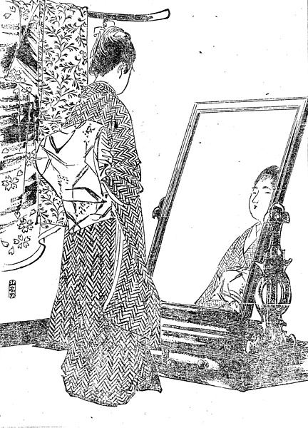 | 説明 | 伊豆半島葉山の町外れに閑静な別荘を抱える一家のお嬢さま。自分の知らないうちに親同士のあいだで結婚話がとりきめられている。しかし自分には密かに想っている人がある。それで気病みして、別荘でひとり過ごしたがる。このお嬢さまの髪型は1890年代(明治20年代)の縦型束髪だが、前を大きく膨らませ、そのため毛の少ない人は前髪かもじを入れる。髱(タボ=後ろ髪)は日本髪の髱と変わりなく下がっている。このスタイルは前年あたりから見られるようになったもので、いわゆる花月巻、といわれるものに共通するようだ。花月巻はある資料では、「円輪のグルリに残りの毛を花の如くからませてある処から名づけた」と言っている。しかしそのかんじんの髷の部分は、あまりよくわからないし、きまりきったものでもなかったろう。(大丸 弘) |