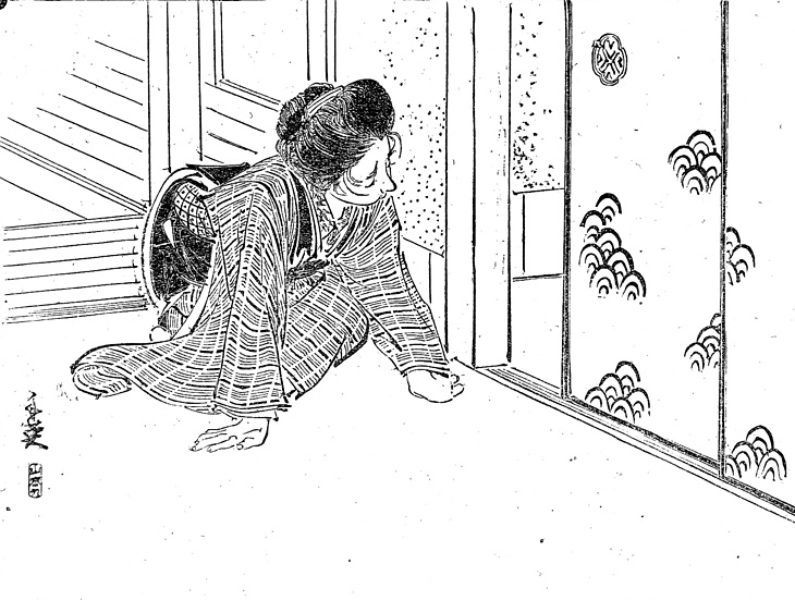 | 説明 | 年始客の訪れを知らせる小間使い。閉じた座敷の中の主人に用件を伝えるときは、あらかじめ声をかけたうえで座って両手で襖を開き、挿絵のように指先を相手の方には向けずに畳に突いて、ものを言う。元日のことなので、召使にもふだん着とはちがうものを着せているだろうが、せいぜい主人のお古の銘仙だろう。個人の家庭では大きな商店の奉公人のような決まった仕着せ制度はないから、主人の思いつきひとつでたいていはお下がりを与えられる。この女の髪ははっきりしないが、女中が束髪を結うのは生意気だと言われたりした。しかし下女中と比べると小間使いは優遇されていたので、地味な束髪のこともあり得た。(大丸 弘) |